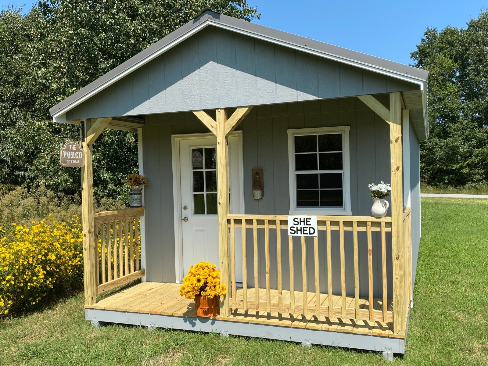 Our Cabin style sheds are our Cottage, High Barn, or A-Frame style sheds with a 6' pressure-treated end porch with rails. Vinyl siding, electrical wiring, and house type doors and windows are optional upgrades. For Kids, we have a Clubhouse style building
